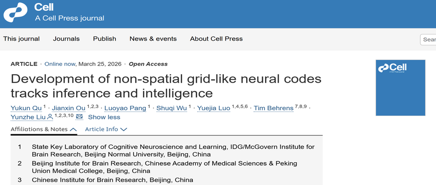 【光明日报】Cell|柳昀哲课题组:内嗅皮层—类网格编码发育支撑抽象推理能力跃迁的神经机制
