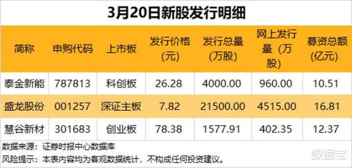 今日(3月20日)共有3只新股集中发行,分别是科创板的泰金新能、深市主板的盛龙股份、创业板的慧谷新材。